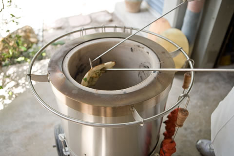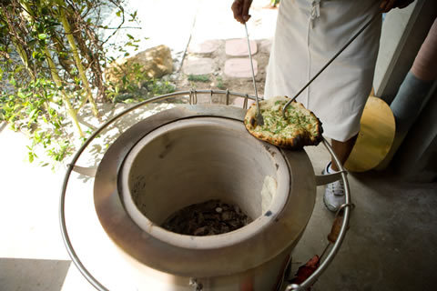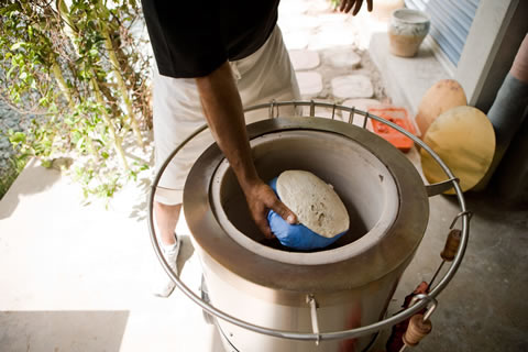 8) Remove the naan with the spatula and hook. Use the hook to poke the bread and the spatula to separate the naan from the wall and push it down the hook.