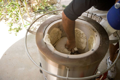 6) Holding onto the back of the gaddi pad, place or ‘slap’ the dough onto the side of the Homdoor wall.