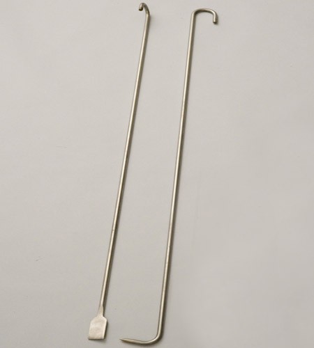 Pair of stainless-steel bread tools 3/16″ round, 30″ long used to take the naan off the wall of the tandoor. One tool is a hook, the other is a spade.